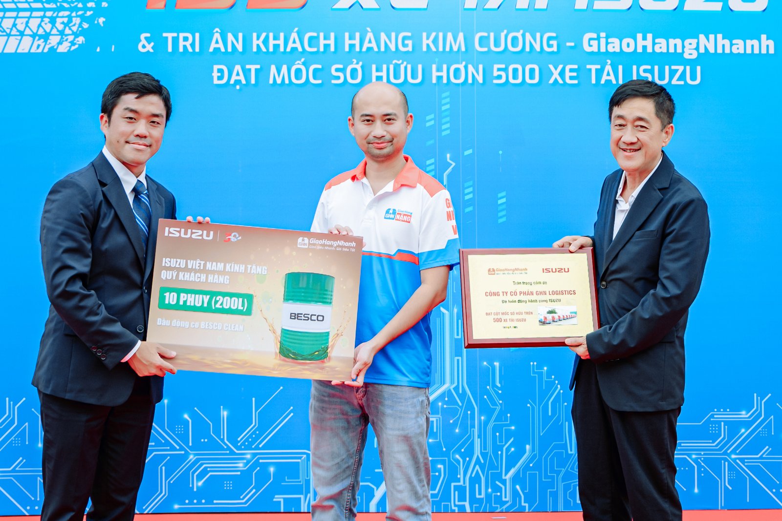 With this latest handover, GHN’s fleet of ISUZU trucks has officially surpassed 500 units. To commemorate this milestone, ISUZU Vietnam presented GHN with the Diamond Customer Certificate and a special gift – 2,000 liters of BESCO Clean engine oil – as a token of appreciation for their enduring trust and partnership.